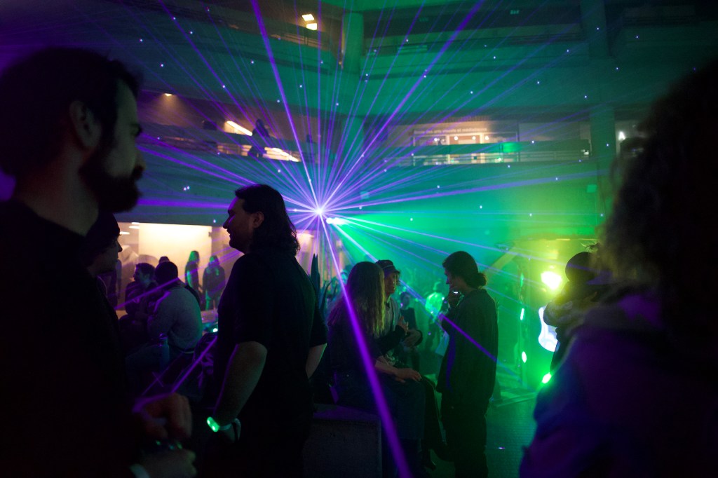 VJ and DJ booths set up on the old fountain in the Agora