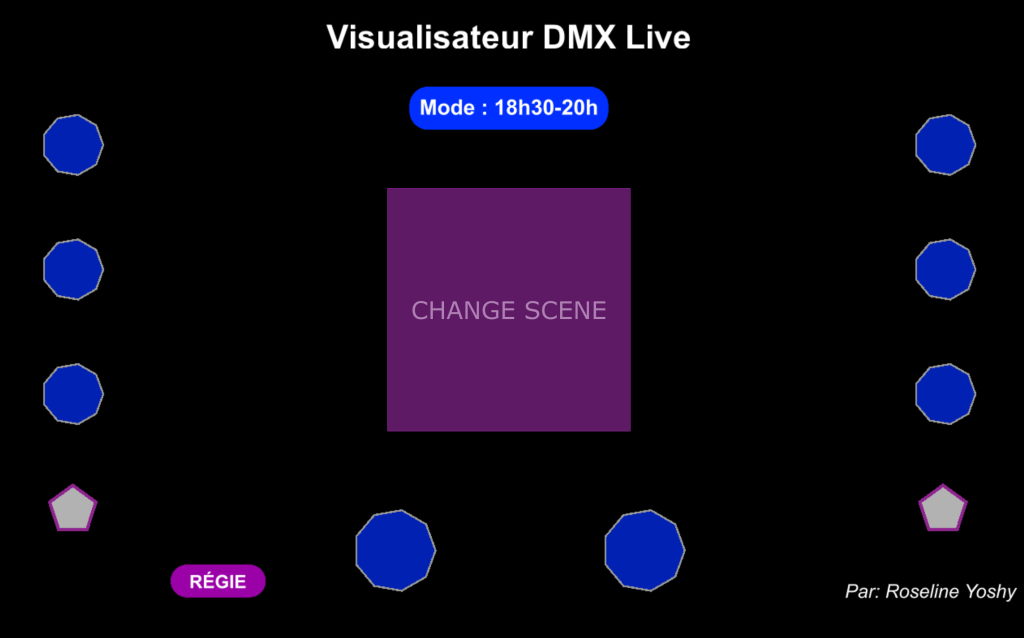 I developed a DMX controller and visualizer using TouchDesigner to manage the lighting surrounding the installation during the event. The lighting design drew inspiration from the trophy’s color palette, contributing to a cohesive and immersive visual environment. In line with the organizers’ request, I also created four custom presets that complemented the signature blue of UQAM’s logo, enhancing the atmosphere for the evening.