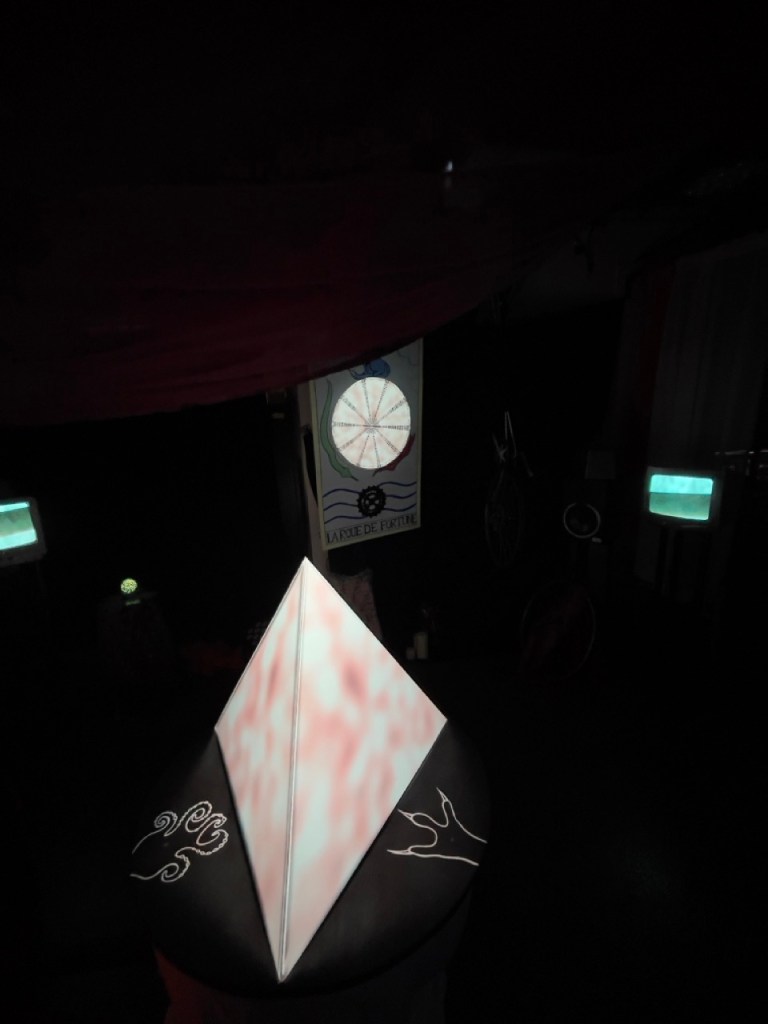 For the lighting, the 3 spots DMX that were used had a 13 channel address each, which allowed me to experiment with light transitions in the different states of the installation : idle, one station activated, two stations activated, three stations activated and generative. I was also in charge of the cable management of our space in order to incorporate the technology within our decor, to create an immersive surrounding.