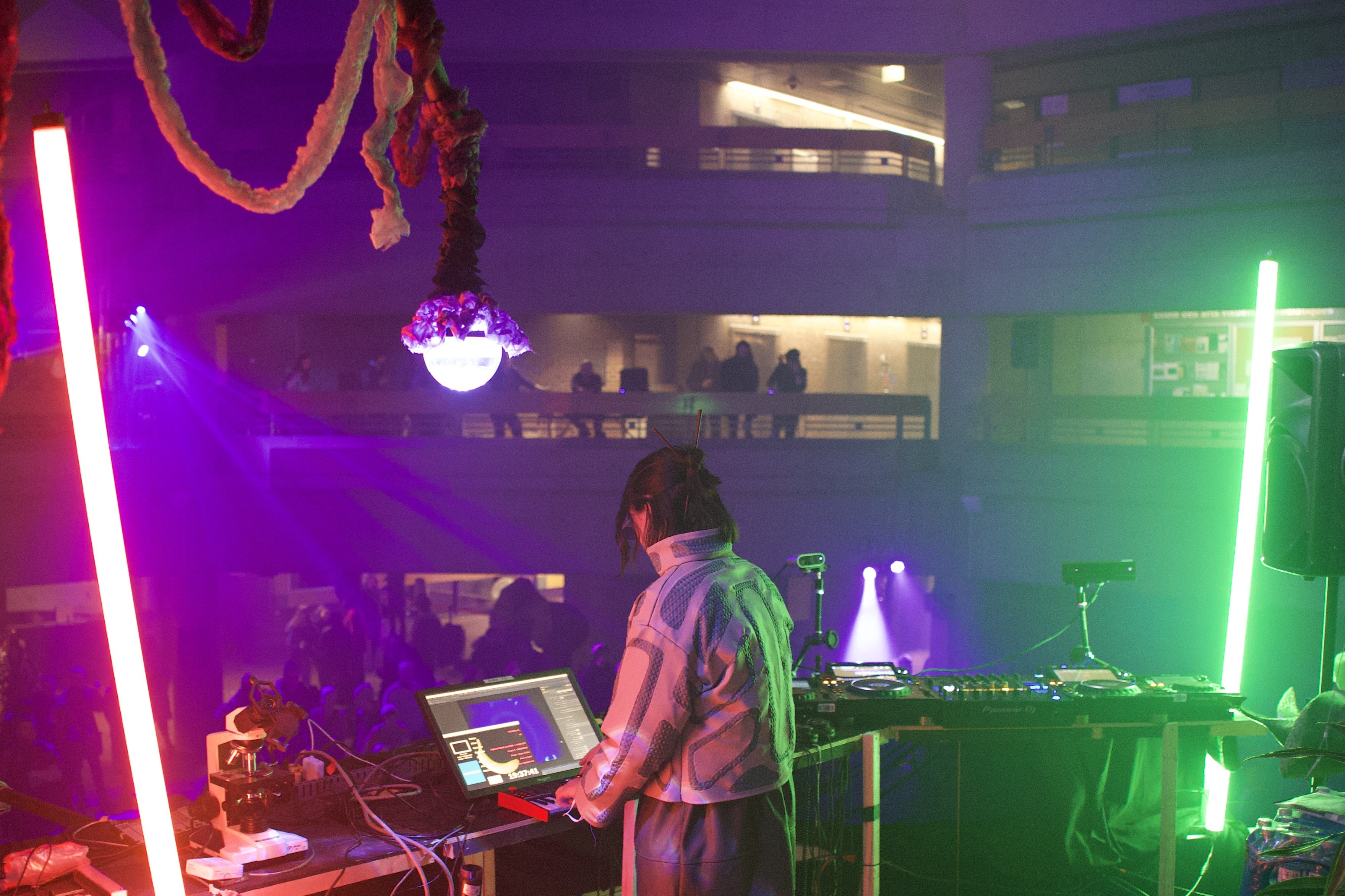Temperature and light cycles orchestrate the rhythm of Exotopie, inspired by speculative biology coexisting with performing arts and technology. The event, designed in a happening format, unfolded over three days in three distinct phases, each offering a unique atmosphere and specific immersive experiences. These stages allowed visitors to gradually dive into the created universe, revealing diverse and captivating aspects of the interactive world showcased in the Agora Judith-Jasmin (UQÀM).